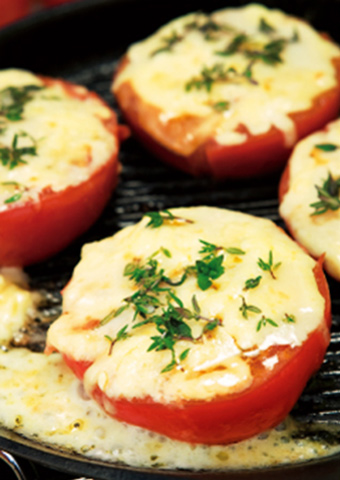 番茄去蒂切半,分别撒上盐和酱油。煎盘上倒上一层橄榄油并加热,将每个番茄的切口处朝煎盘放置,煎至上色。然后将其反转,放上芝士和百里香,盖上盖子煎至芝士完全融化。